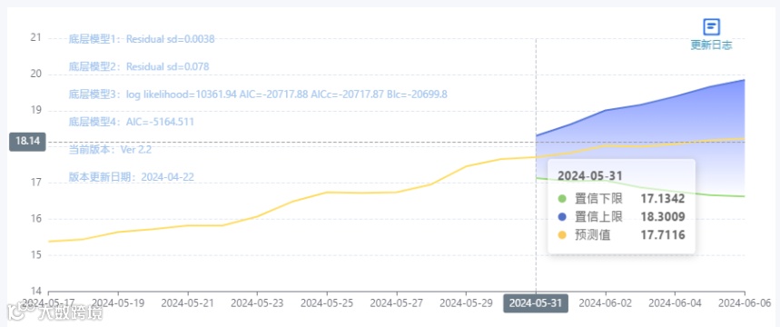 玄田算法是由项目课题组团队原创的非经典逻辑数值聚合理论和不确定性预测方法,构建了基于一致模算子的生猪价格预测模型。该模型采用的聚合函数及一致模相关理论与方法已获得多项国家自然科学基金和省级自然科学资金资助,并获得多项省级自然科学奖奖项。05月31日预测猪价为17.7116,置信区间在17.1342--18.3006之间。06月01日预测猪价为17.8301;06月02日预测猪价为18.0336。