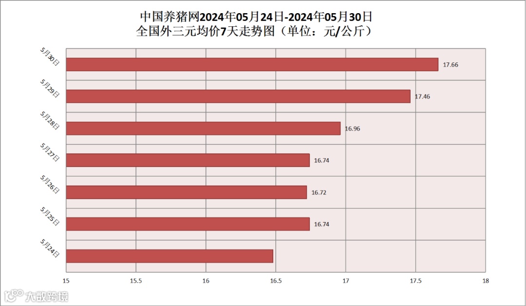 其他生猪品种方面,生猪内三元均价为17.36元/公斤,价格较昨日(17.14元/公斤)上涨了0.22元/公斤;生猪土杂猪均价为16.78元/公斤,价格较昨日(16.62元/公斤)上涨了0.16元/公斤。
