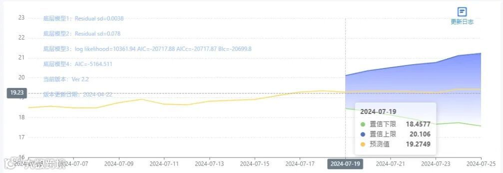 玄田算法是由项目课题组团队原创的非经典逻辑数值聚合理论和不确定性预测方法,构建了基于一致模算子的生猪价格预测模型。该模型采用的聚合函数及一致模相关理论与方法已获得多项国家自然科学基金和省级自然科学资金资助,并获得多项省级自然科学奖奖项。07月19日预测猪价为19.2749,置信区间在18.4577--20.106之间。07月20日预测猪价为19.3376;07月21日预测猪价为19.3212。