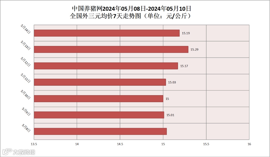 2024年05月14日(星期二),据中国养猪网猪价系统监测,全国外三元均价为15.19元/公斤,猪价较昨日(15.29元/公斤)下跌了0.10元/公斤,较上月(15.26元/公斤)下跌了0.07元/公斤。