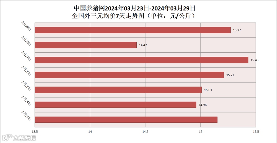 其他生猪品种方面,生猪内三元均价为15.11元/公斤,价格较昨日(15.10元/公斤)上涨了0.01元/公斤;生猪土杂猪均价为14.64元/公斤,价格较昨日(14.67元/公斤)下跌了0.03元/公斤。