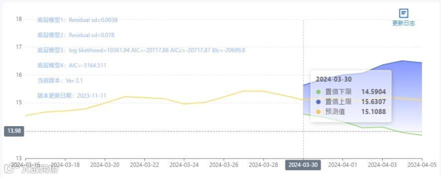 玄田算法是由项目课题组团队原创的非经典逻辑数值聚合理论和不确定性预测方法,构建了基于一致模算子的生猪价格预测模型。该模型采用的聚合函数及一致模相关理论与方法已获得多项国家自然科学基金和省级自然科学资金资助,并获得多项省级自然科学奖奖项。03月30日预测猪价为15.1088,置信区间在14.5904--15.6307之间。03月31日预测猪价为15.1632;04月01日预测猪价为15.1547。
