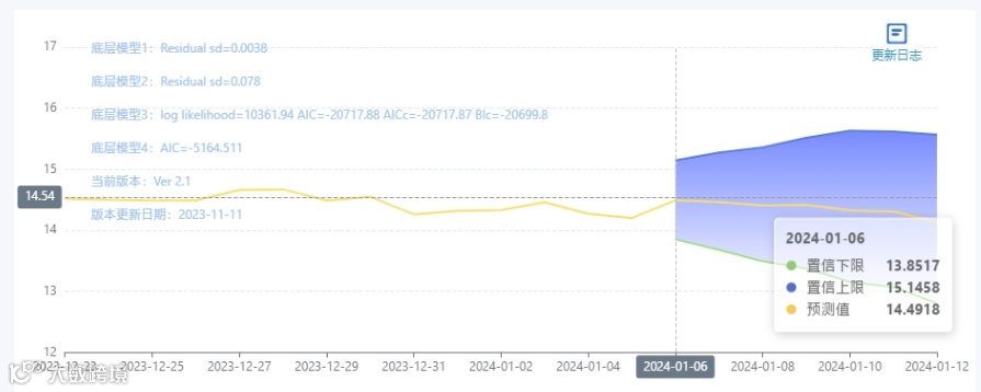 玄田算法是由项目课题组团队原创的非经典逻辑数值聚合理论和不确定性预测方法,构建了基于一致模算子的生猪价格预测模型。该模型采用的聚合函数及一致模相关理论与方法已获得多项国家自然科学基金和省级自然科学资金资助,并获得多项省级自然科学奖奖项。01月06日预测猪价为14.4918,置信区间在13.8517--15.1458之间。01月07日预测猪价为14.4618;01月08日预测猪价为14.4081。