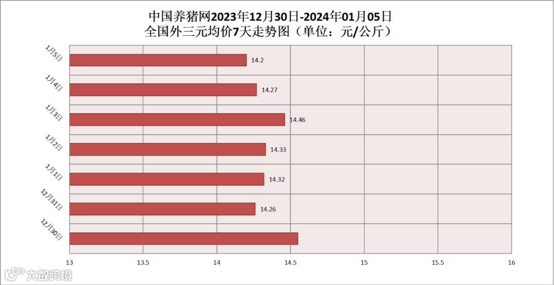 根据“2024年01月05日-中国养猪网生猪(外三元)均价涨跌表”发现,国内外三元生猪价格依旧呈现小幅走跌行情,在全国可监测的31个省/市/自治区中,最低为新疆维吾尔自治区12.52元/公斤,最高为海南省13.09元/公斤。随着北方猪源集中调入,南方腌腊地区大猪供应“井喷”,肥猪支撑转弱,标肥价差倒挂,这进一步加剧了养殖端出栏心态,多地猪价处于6-7元区间。短时市场难有转好契机,预计猪价或保持震荡偏弱为主。(备注:本文出现的生猪价格及猪价特指活猪价格,并非是消费市场常见的猪肉价、内三元、土杂猪则为生猪品种。)