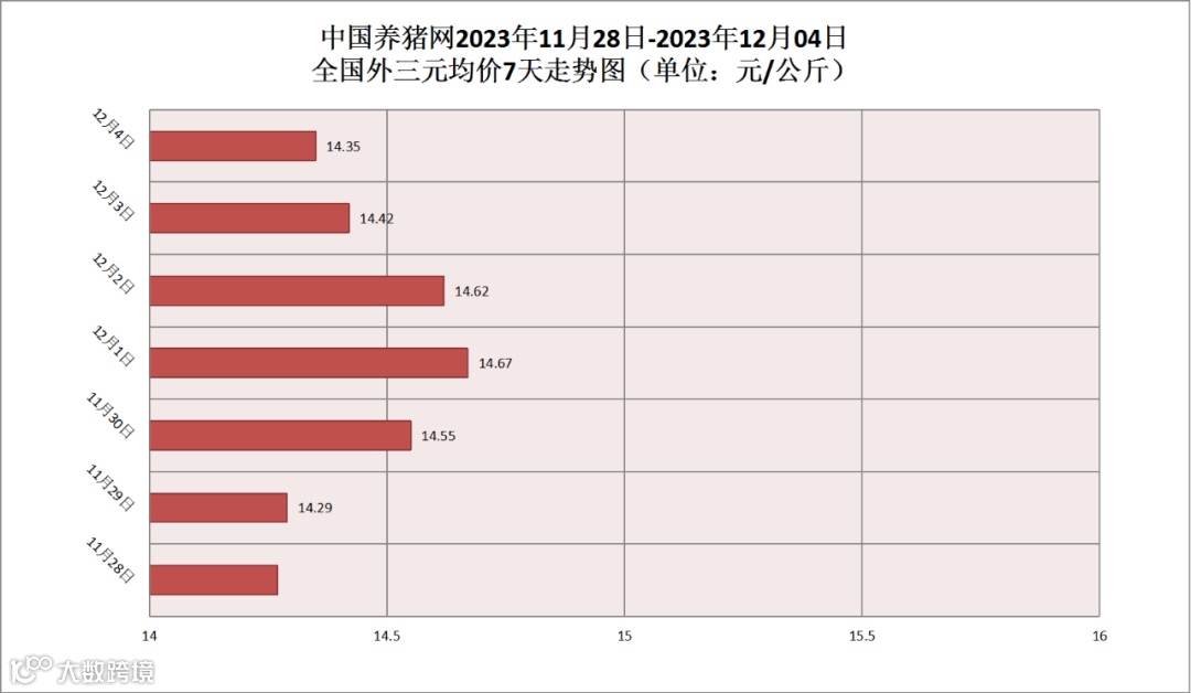 2023年12月04日(星期一),据中国养猪网猪价系统监测,全国外三元均价为14.35元/公斤,猪价较昨日(14.42元/公斤)下跌了0.07元/公斤,较上月(15.02元/公斤)下跌了0.67元/公斤。