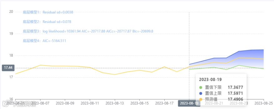 玄田算法是由项目课题组团队原创的非经典逻辑数值聚合理论和不确定性预测方法,构建了基于一致模算子的生猪价格预测模型。该模型采用的聚合函数及一致模相关理论与方法已获得多项国家自然科学基金和省级自然科学资金资助,并获得多项省级自然科学奖奖项。08月19日预测猪价为17.4906,置信区间在17.3677-17.5971之间。08月20日预测猪价为17.5890;08月21日预测猪价为17.6921。