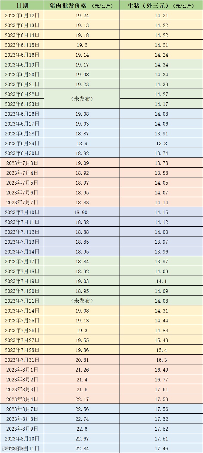 据农业农村部监测,8月11日,全国农产品批发市场猪肉平均价格为22.84元/公斤,与上周五(8月4日)的22.17元/公斤相比,上涨3%。本周的平均价格为22.68元/公斤,与上周21.45元/公斤的均价相比,上涨5.7%。