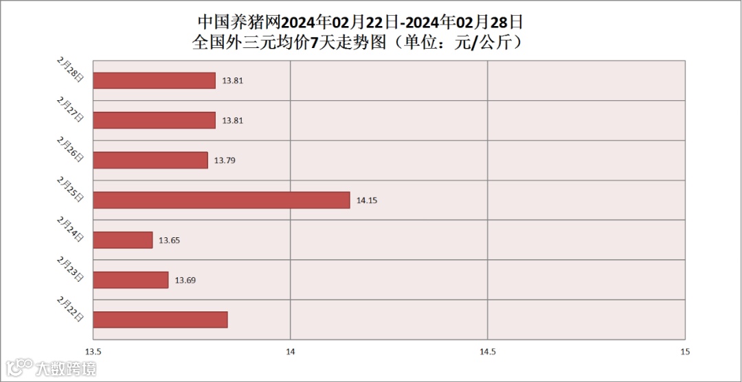 其他生猪品种方面,生猪内三元均价为13.99元/公斤,价格较昨日(14.02元/公斤)下跌了0.03元/公斤;生猪土杂猪均价为13.57元/公斤,价格较昨日(13.61元/公斤)上涨了0.04元/公斤。