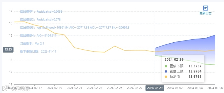 玄田算法是由项目课题组团队原创的非经典逻辑数值聚合理论和不确定性预测方法,构建了基于一致模算子的生猪价格预测模型。该模型采用的聚合函数及一致模相关理论与方法已获得多项国家自然科学基金和省级自然科学资金资助,并获得多项省级自然科学奖奖项。02月29日预测猪价为13.6761,置信区间在13.3737--13.9784之间。03月01日预测猪价为13.7602;03月02日预测猪价为13.8233。