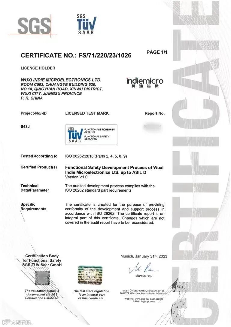 无锡英迪芯微电子科技股份有限公司(以下简称“英迪芯微”)于2023年2月28日荣获国际公认的检验、测试和认证机构SGS颁发的基于车规级功能安全标准ISO 26262:2018 ASIL D流程认证证书,标志着英迪芯微的产品开发流程体系达到了国际先进水平。
