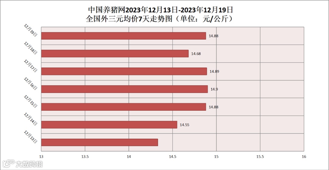 2023年12月19日(星期二),据中国养猪网猪价系统监测,全国外三元均价为14.88元/公斤,猪价较昨日(14.68元/公斤)上涨了0.20元/公斤,较上月(14.84元/公斤)上涨了0.04元/公斤。