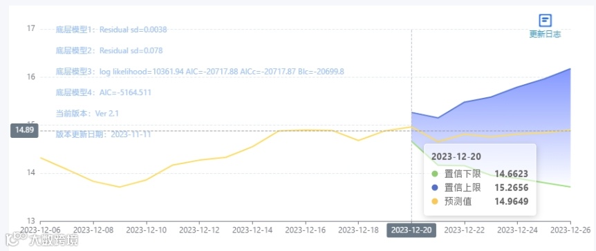 玄田算法是由项目课题组团队原创的非经典逻辑数值聚合理论和不确定性预测方法,构建了基于一致模算子的生猪价格预测模型。该模型采用的聚合函数及一致模相关理论与方法已获得多项国家自然科学基金和省级自然科学资金资助,并获得多项省级自然科学奖奖项。12月20日预测猪价为14.3569,置信区间在13.8757--14.8424之间。12月21日预测猪价为14.4636;12月22日预测猪价为14.3648。