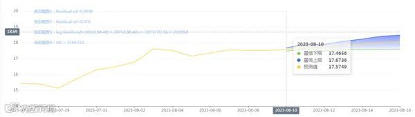 玄田算法是由项目课题组团队原创的非经典逻辑数值聚合理论和不确定性预测方法,构建了基于一致模算子的生猪价格预测模型。该模型采用的聚合函数及一致模相关理论与方法已获得多项国家自然科学基金和省级自然科学资金资助,并获得多项省级自然科学奖奖项。08月10日预测猪价为17.5749,置信区间在17.4656--17.6736之间。08月11日预测猪价为17.7806;08月12日预测猪价为17.7068。
