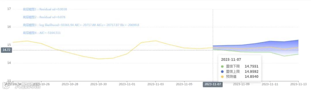 玄田算法是由项目课题组团队原创的非经典逻辑数值聚合理论和不确定性预测方法,构建了基于一致模算子的生猪价格预测模型。该模型采用的聚合函数及一致模相关理论与方法已获得多项国家自然科学基金和省级自然科学资金资助,并获得多项省级自然科学奖奖项。11月07日预测猪价为14.8540,置信区间在14.7551--14.9592之间。11月08日预测猪价为14.8366;11月09日预测猪价为14.8015。