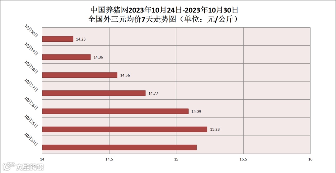 2023年10月30日(星期一),据中国养猪网猪价系统监测,全国外三元均价为14.23元/公斤,猪价较昨日(15.36元/公斤)下跌了0.13元/公斤,较上月(16.39元/公斤)下跌了2.16元/公斤。