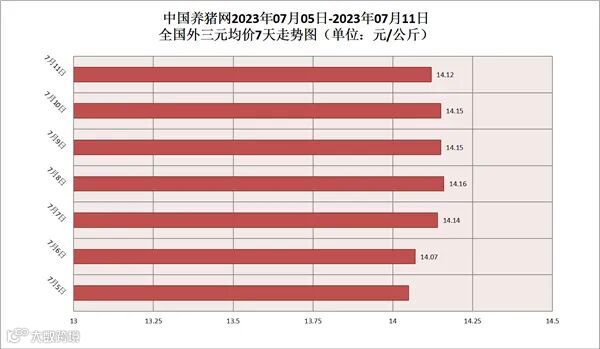2023年07月11日(星期二),据中国养猪网猪价系统监测,全国外三元均价为14.12元/公斤,猪价较昨日(14.15元/公斤)下跌了0.03元/公斤,较上月(14.23元/公斤)下跌了0.11元/公斤。