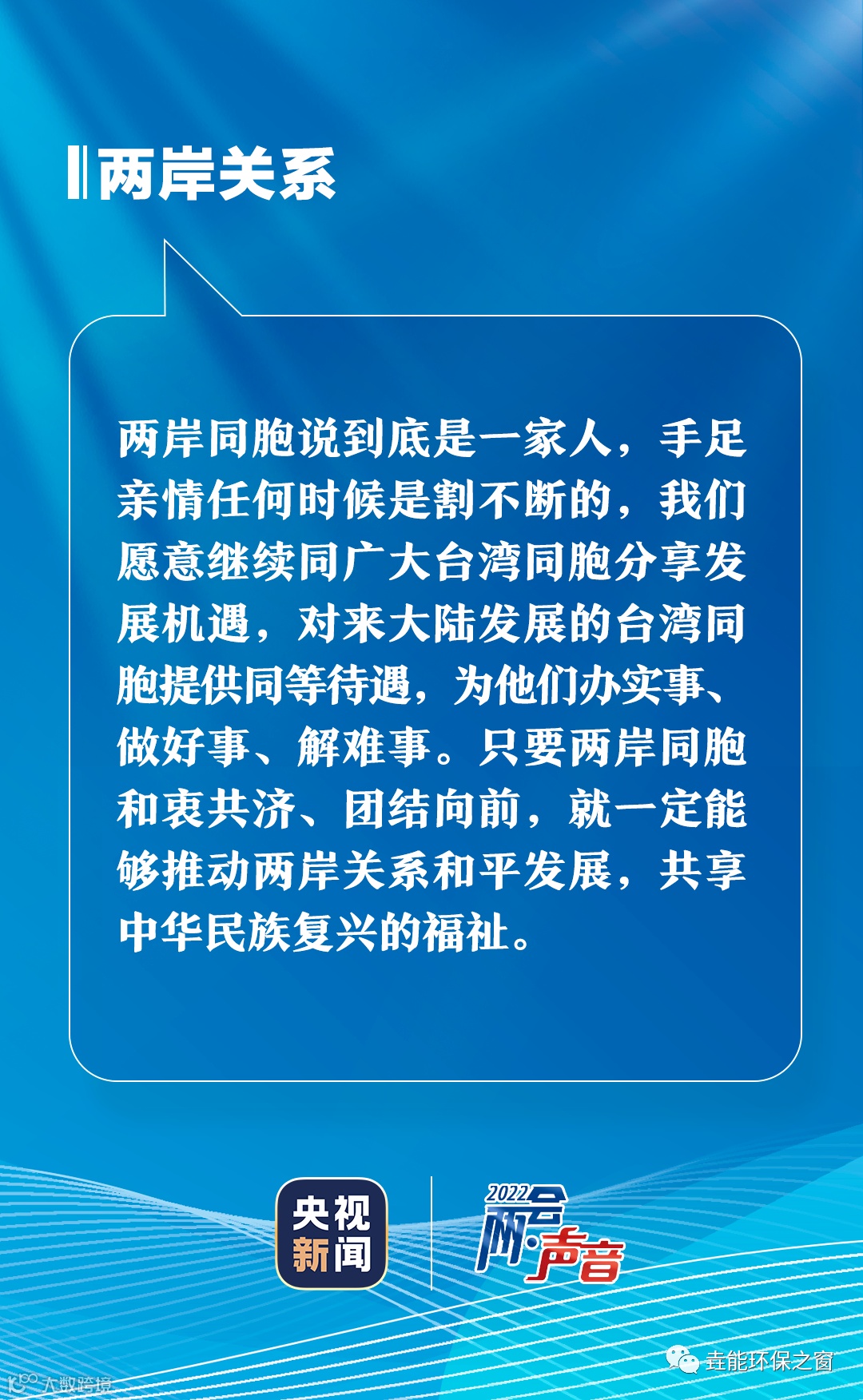 两岸同胞说到底是一家人,手足亲情任何时候是割不断的。只要两岸同胞和衷共济、团结向前,就一定能够推动两岸关系和平发展,共享中华民族复兴的福祉。