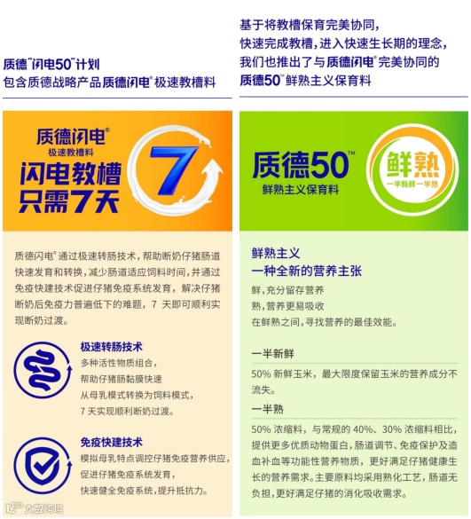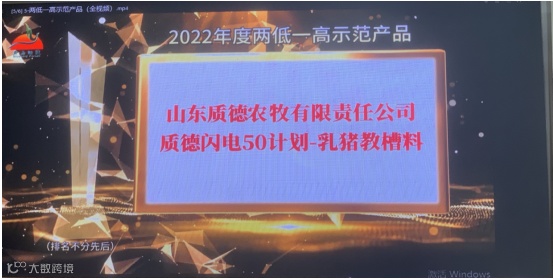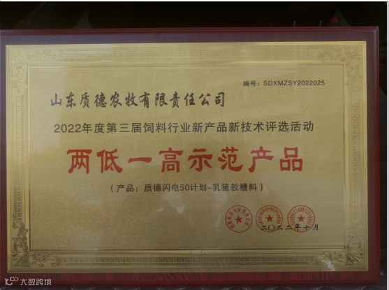 质德集团推送的年度新品“闪电50计划—乳猪教槽料”获评“两低一高示范产品”。