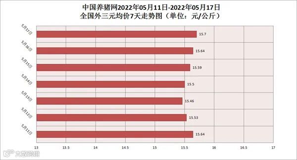2022年05月17日(星期二),据中国养猪网猪价系统监测,全国外三元均价为15.70元/公斤,猪价较昨日(15.64元/公斤)上涨了0.06元/公斤,较上月(12.92元/公斤)上涨了2.78元/公斤。