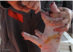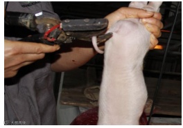 通过断尾可降低猪群的咬尾概率,提高饲料利用率。猪只用途不同,断尾长度略有差异。一般商品猪保留三分之一、种猪保留三分之二,断尾前仔猪应吃上足够初乳,且在仔猪出生后48 h内完成。目前常用电热断尾钳对仔猪进行断尾,可很大程度上防止断尾时出血。断尾前应对断尾钳先进行预热,达到设定温度再进行断尾操作。断尾操作过程中断尾钳不要碰到仔猪其他部位,以免烫伤(见图4)。