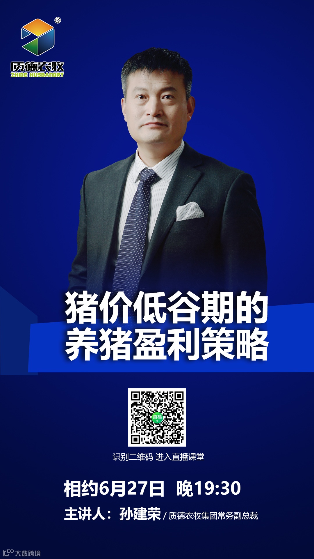 6月27日相约质德商学院,质德集团副总裁兼技术总监孙建荣先生为您带来《猪价低谷期的养猪盈利策略》,6月27日19点30分与您不见不散,扫码即可进入直播间。