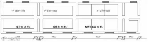③种公猪、待配母猪舍一栋,8个栏,栋长3×8=24米,单列舍宽5.5米。
