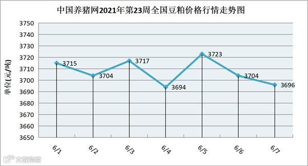 据中国养猪网猪价系统数据监测,2021年第23周(2021年06月01日至2021年06月07日)本周豆粕价格行情走势震荡偏弱,有所下跌。全周豆粕价格区间在3696-3723元/吨之间,周初豆粕价格为3715元/吨,周末价格为3696元/吨,全周豆粕价格累计下跌了19元/吨。