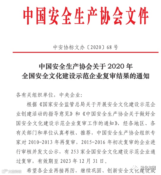2020年12月30日,中国安全生产协会下发了《关于2020年全国安全文化建设示范企业复审结果的通知》,雅化集团顺利通过中国安全生产协会组织的2020年全国安全文化建设示范企业复审。