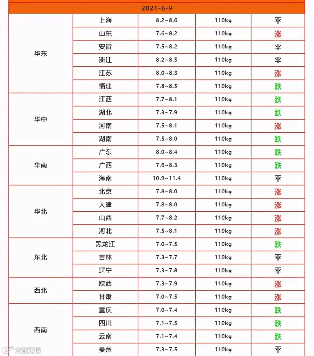 纵观6月9日生猪价格,共有9个省市继续上涨,10个省市遭遇下跌。上涨地区有山东、江苏分别上涨0.3元和0.1元;河南上涨0.3元;北京和天津上涨0.5元,河北和山西上涨0.3元;陕西上涨0.2元,甘肃上涨0.1元。下跌地区有黑龙江下跌0.3元,江西、福建下降0.2元,湖北、湖南分别下跌0.2元和0.1元,广东、广西下跌0.3元和0.4元,四川和云南下跌0.4元,重庆跌幅最大,下跌0.7元。剩下省市包括吉林、辽宁、浙江、安徽、贵州等地保持稳定。全国生猪均价,外三元生猪价格为15.62元,内三元为15.14元,土杂猪为14.61元。