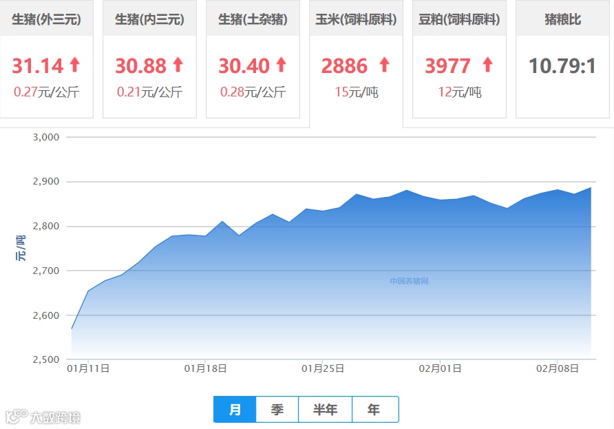 | 地区名称 | 外三元(元/公斤) | 内三元(元/公斤) | 土杂猪(元/公斤) | 玉米(元/吨) | 豆粕(元/吨) |