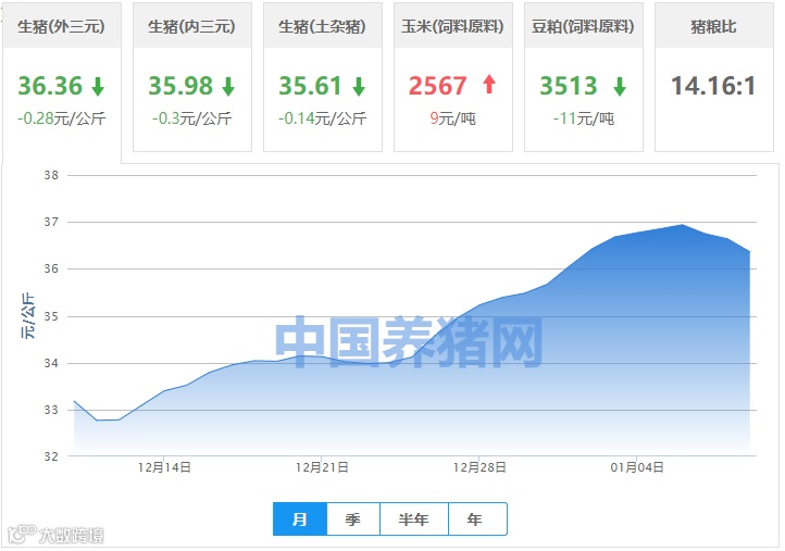 | 地区名称 | 外三元(元/公斤) | 内三元(元/公斤) | 土杂猪(元/公斤) | 玉米(元/吨) | 豆粕(元/吨) |