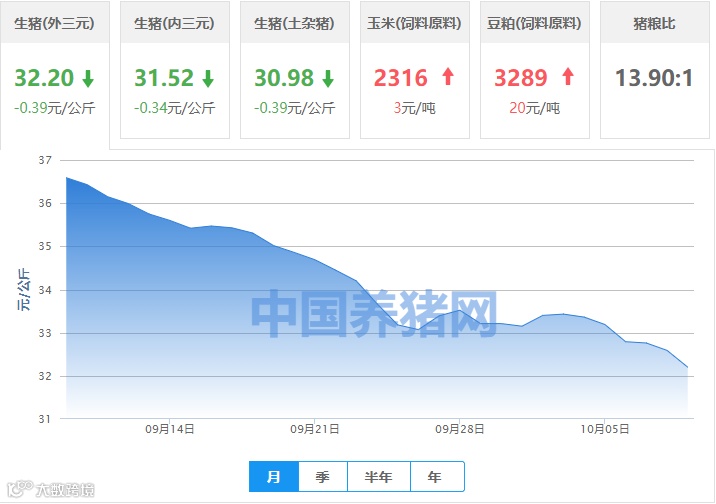 | 地区名称 | 外三元(元/公斤) | 内三元(元/公斤) | 土杂猪(元/公斤) | 玉米(元/吨) | 豆粕(元/吨) |