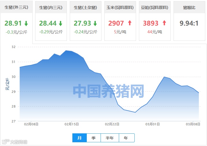 | 地区名称 | 外三元(元/公斤) | 内三元(元/公斤) | 土杂猪(元/公斤) | 玉米(元/吨) | 豆粕(元/吨) |