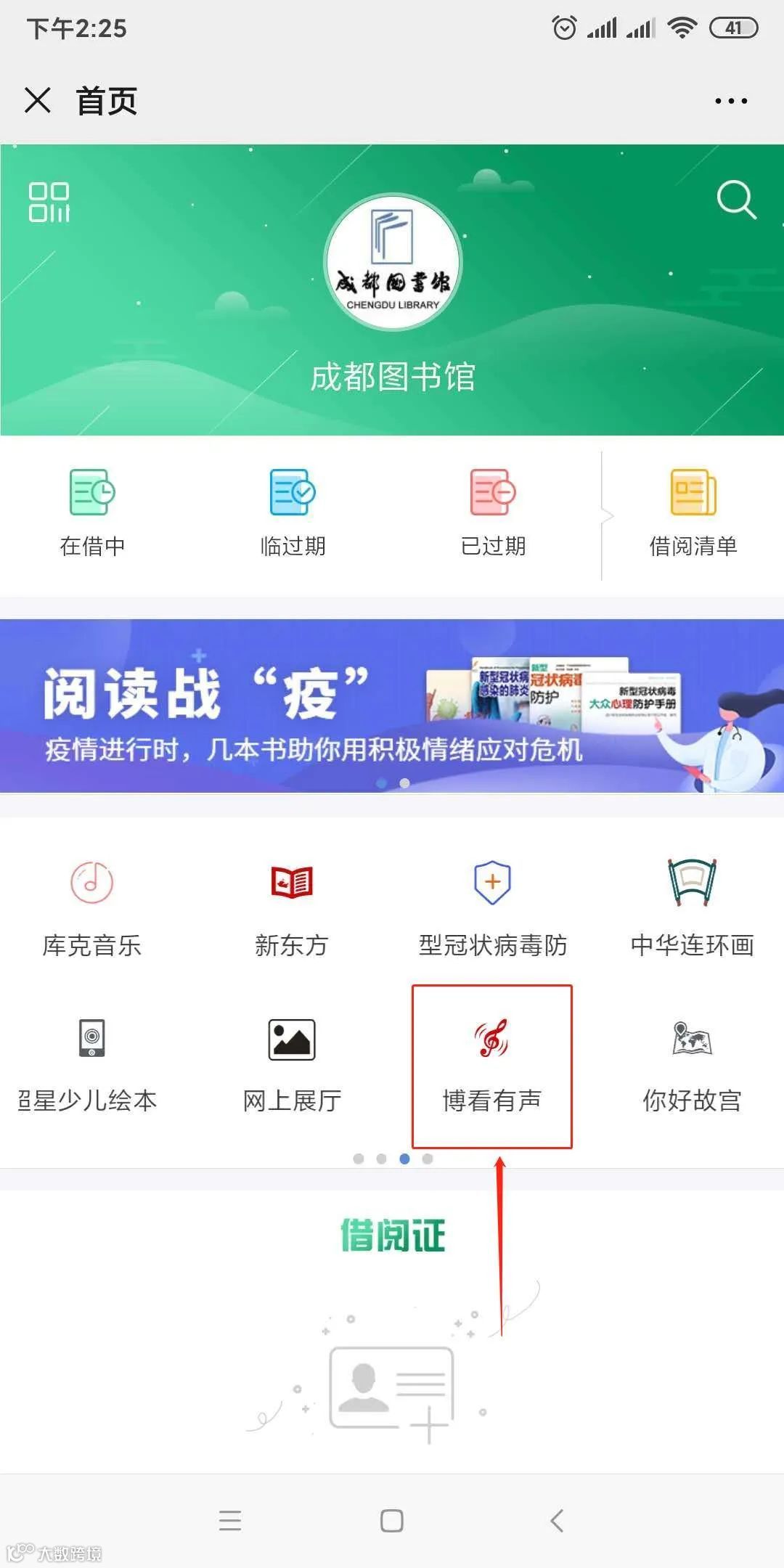 1.关注“成都图书馆”微信公众号,点击菜单“微服务大厅”进入“博看有声”,手机号免费注册登录。