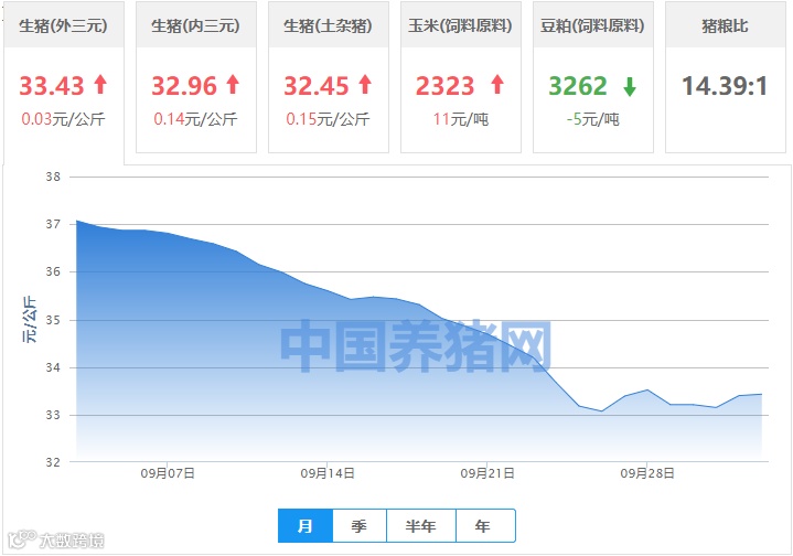 | 地区名称 | 外三元(元/公斤) | 内三元(元/公斤) | 土杂猪(元/公斤) | 玉米(元/吨) | 豆粕(元/吨) |
