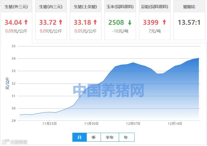 | 地区名称 | 外三元(元/公斤) | 内三元(元/公斤) | 土杂猪(元/公斤) | 玉米(元/吨) | 豆粕(元/吨) |