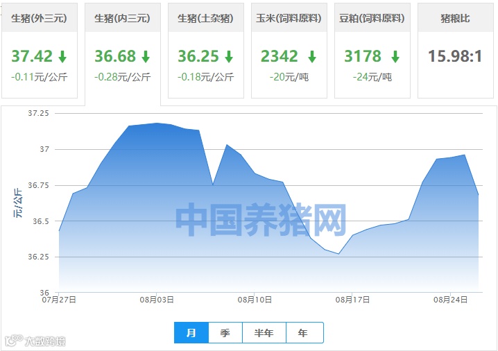 | 地区名称 | 外三元(元/公斤) | 内三元(元/公斤) | 土杂猪(元/公斤) | 玉米(元/吨) | 豆粕(元/吨) |