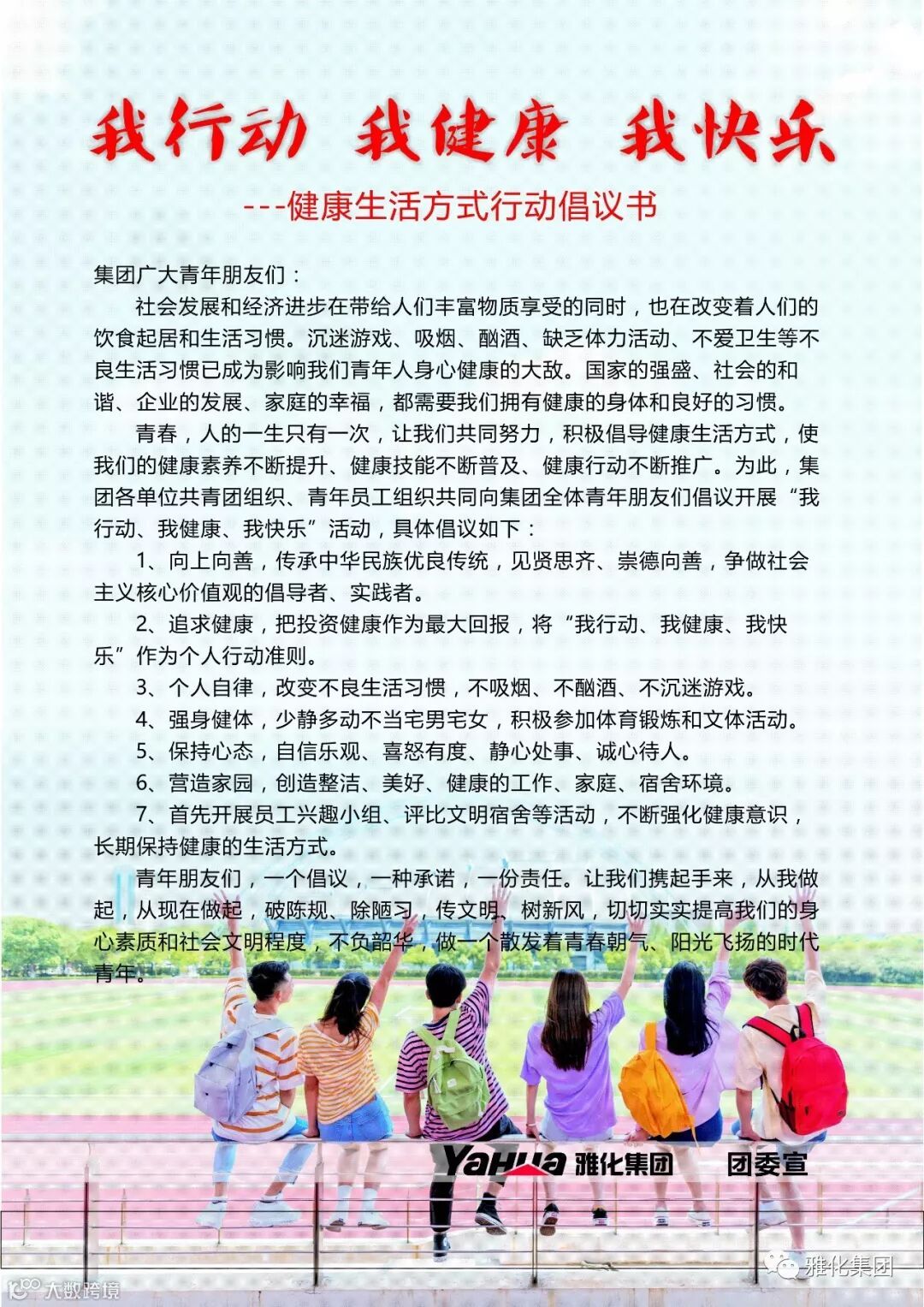 近日,集团股份公司团委联合集团各单位共青团组织、青年员工组织共同向集团全体青年朋友们倡议开展“我行动、我健康、我快乐”活动,倡议在我们一生只有一次的青春时光里,共同努力,以向上向善、追求健康、个人自律的健康生活方式,让我们的健康素养不断提升、健康技能不断普及、健康行动不断推广。集团企业文化系统也将陆续组织开展员工兴趣活动小组、文明宿舍评比、员工喜闻乐见的体育活动。让我们活力四射动起来,不负韶华,做一个散发着青春朝气、阳光飞扬的时代青年。