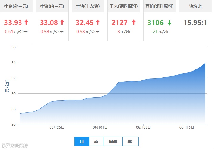 | 地区名称 | 外三元(元/公斤) | 内三元(元/公斤) | 土杂猪(元/公斤) | 玉米(元/吨) | 豆粕(元/吨) |