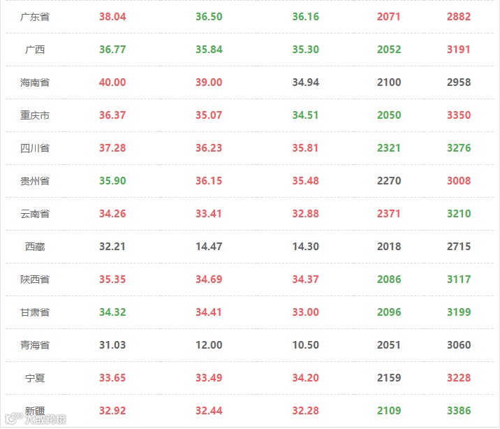 | 新疆 | 33.40 | 33.36 | 33.13 | 2111 | 3456 |