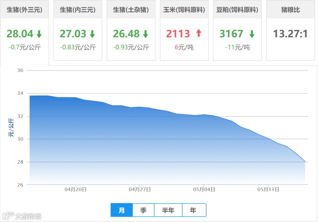 | 地区名称 | 外三元(元/公斤) | 内三元(元/公斤) | 土杂猪(元/公斤) | 玉米(元/吨) | 豆粕(元/吨) |