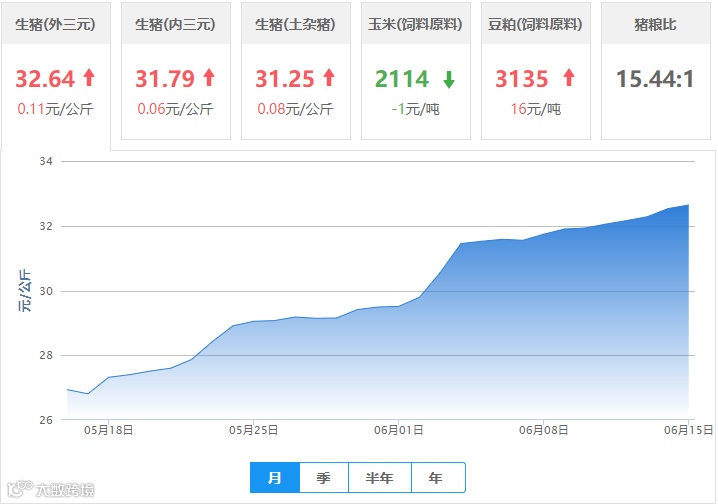 | 地区名称 | 外三元(元/公斤) | 内三元(元/公斤) | 土杂猪(元/公斤) | 玉米(元/吨) | 豆粕(元/吨) |