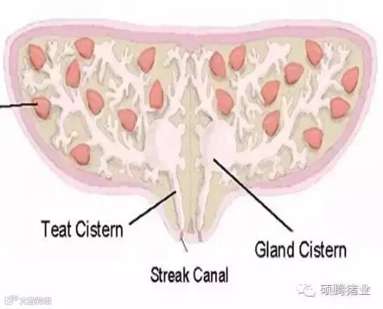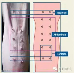 母猪的乳腺一般有7-8对乳头,个别猪只可以见到9对以上,如太湖猪中的二花脸亚群可以见到10对乳头,乳头分布一般为(如图示一所示):胸腔2对,腹腔4-5对,腹股沟1对,乳汁最好为前3对奶房,其血液循环最丰富而泌乳量最大,最后一对奶头泌乳量相对最低,且易受后躯污染患上乳腺炎,在生产中在该对奶头哺乳的仔猪最易发生腹泻。