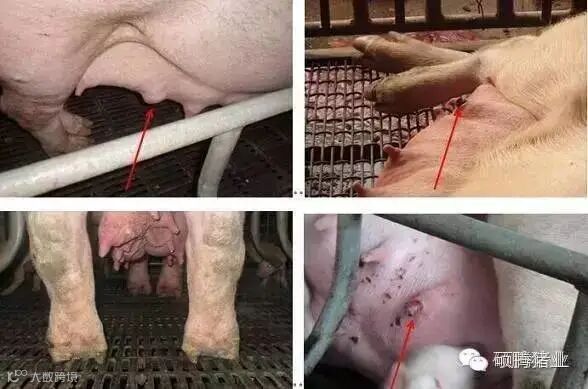 刮伤或夹伤:尖锐物刮伤乳头,母猪乳头暴露在外没有得到保护,特别是在怀孕后期很容易受猪舍内外尖锐物的刮伤;产床地板也容易夹伤乳头,其损伤也最厉害的,国内目前市售母猪漏缝板缝隙没有统一标准,多数为铸铁、也有使用水泥地板、最近有较多的猪场开始使用复合材料地板。而地板缝隙并没有根据母猪乳房的大小、哺乳母猪的特点来确定缝隙的大小,母猪躺卧时乳头陷入地板缝隙中,呈现乳头被夹伤的现象。