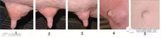 母猪乳腺主要由乳腺导管和脂肪组成,每个乳房由两个独立的乳腺组织组成,如上面图二所示,分泌乳汁是每个乳腺组织独立运行的。乳腺的功能受乳头形态的影响。生产中可分为以下5种形态,如图三所示,生产中对应的乳头为如图示四所示,下面分别介绍。