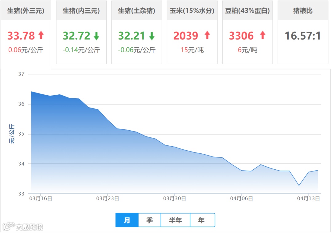 | 地区名称 | 外三元(元/公斤) | 内三元(元/公斤) | 土杂猪(元/公斤) | 玉米(元/吨) | 豆粕(元/吨) |