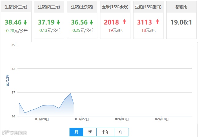| 地区名称 | 外三元(元/公斤) | 内三元(元/公斤) | 土杂猪(元/公斤) | 玉米(元/吨) | 豆粕(元/吨) |