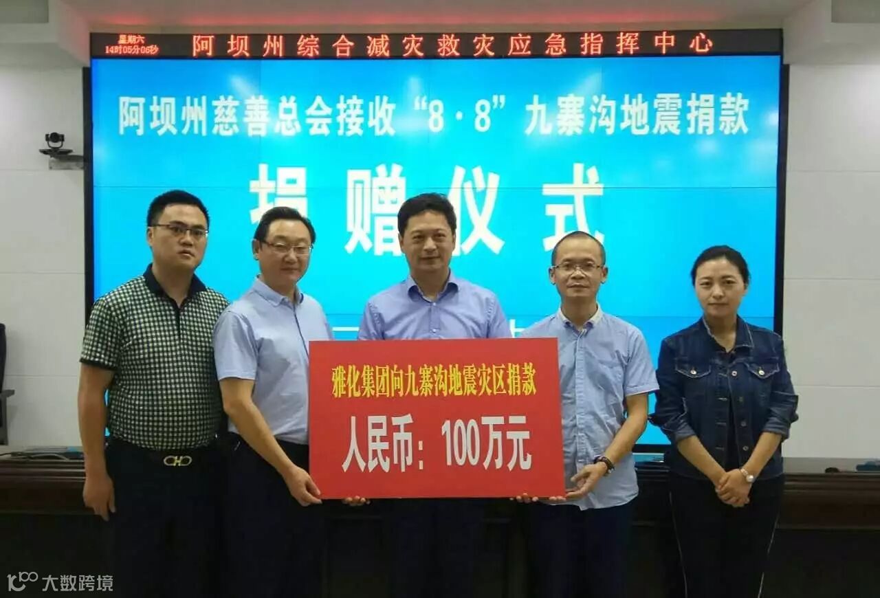 雅化集团得知灾情后,迅速通过阿坝州慈善总会向九寨沟地震灾区捐款100万元,帮助灾区抗震救灾、重建家园。