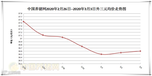 2020年3月3日,据中国养猪网猪价系统监测全国外三元均价为36.60元/公斤,价格较昨日上涨了0.05元/公斤。上周全国外三元均价为36.92元/公斤,今日较上周下跌了0.32元/公斤。内三元均价为35.62元/公斤,较昨日下跌了0.06元/公斤。土杂猪均价为35.29元/公斤,价格较昨日上涨了0.22元/公斤。