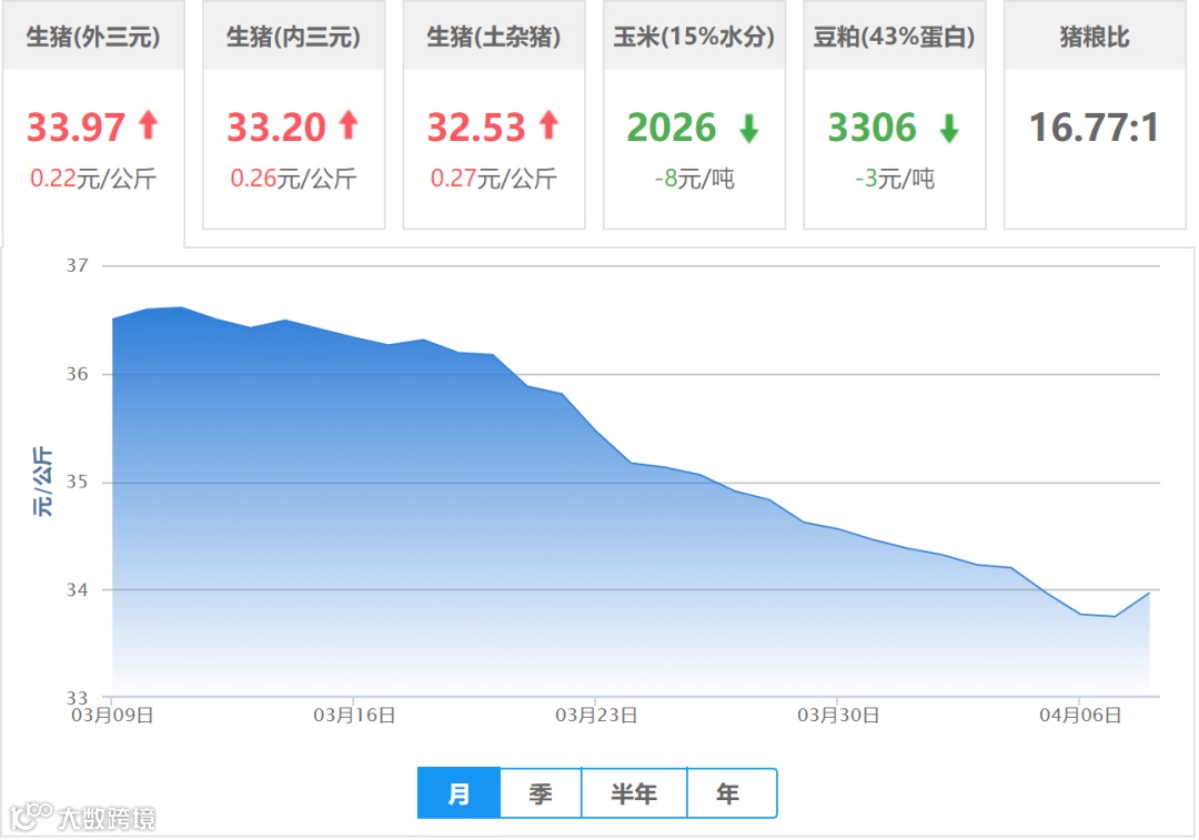 | 地区名称 | 外三元(元/公斤) | 内三元(元/公斤) | 土杂猪(元/公斤) | 玉米(元/吨) | 豆粕(元/吨) |